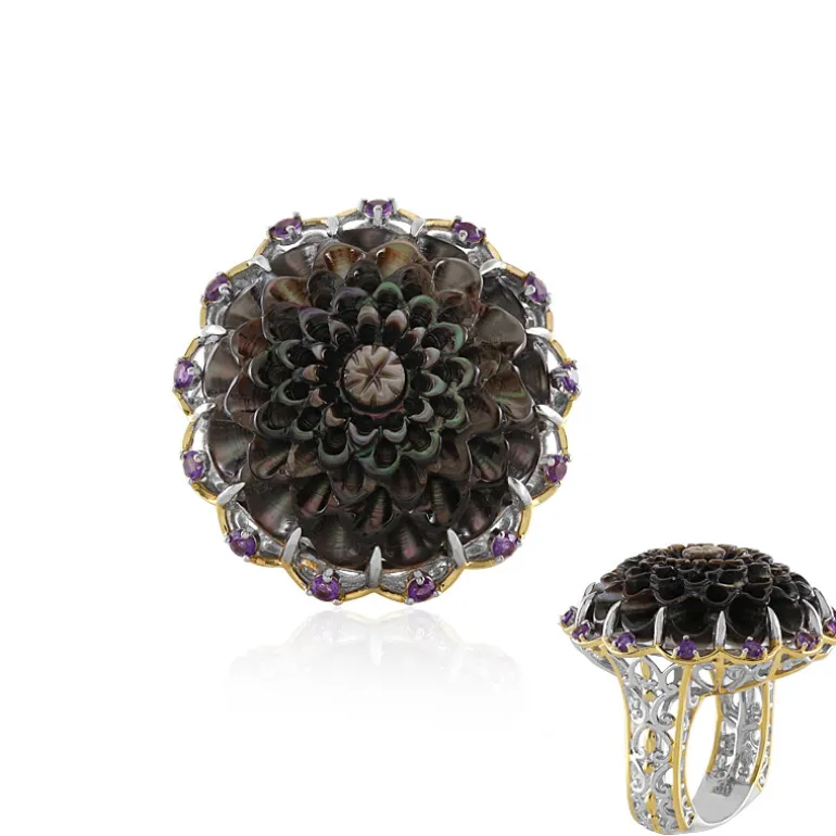 Tauchen Sie ein in die opulente Schönheit dieses Rings aus Sterlingsilber, in dem der dunkle Glanz von schwarzem chinesischem Perlmutt eine fesselnde Blumenpracht bildet. 13 brasilianische Amethyste im Rundschliff mit einem Gesamtgewicht von 0,386 ct umgeben diesen 25 mm großen zentralen Edelstein und verleihen ihm einen königlichen Hauch von violettem Glanz. Das große Design von 31 x 24 mm ist eine kühne Aussage, perfekt für Abendveranstaltungen oder wenn Sie Ihr Tagesensemble aufwerten möchten. Dieser edle Ring ist das Herzstück Ihrer Accessoire-Kollektion.