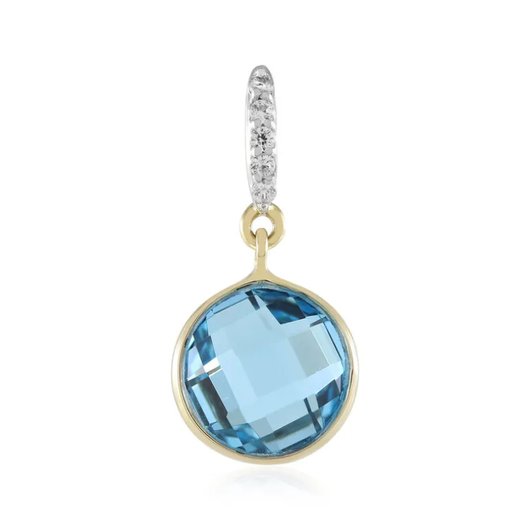 Dieser exquisite Anhänger zeigt einen faszinierenden Schweizer Blautopas aus Brasilien, der mit einem kunstvollen Briolett-Schliff versehen ist, um seine brillanten Farbtöne zu betonen. Das mit fünf funkelnden Zirkonsteinen besetzte Schmuckstück ist in 375er Gelbgold gefasst und strahlt Eleganz und Raffinesse aus. Es eignet sich sowohl für legere als auch für formelle Anlässe und kann mit einer einfachen Goldkette kombiniert werden, um seine Schönheit zur Geltung zu bringen. Eine zeitlose Ergänzung für jede Schmucksammlung.