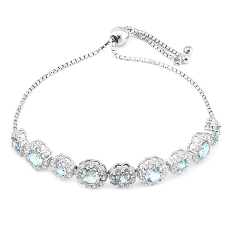 Entdecken Sie Eleganz mit diesem atemberaubenden Swiss Blue Topaz Silberarmband. Es ist von 17,5 bis 25 cm verstellbar und verbindet Funktionalität mit Schönheit, was es zu einem vielseitigen Accessoire für jedes Handgelenk macht. Die schimmernden Blautopas-Edelsteine verleihen dem Armband einen Hauch von Eleganz und eignen sich sowohl für das tägliche Tragen als auch für besondere Anlässe. Kombinieren Sie sie mit einem Cocktailkleid für einen glamourösen Abendlook oder verleihen Sie Ihrem Wochenend-Ensemble einen Hauch von Glanz.