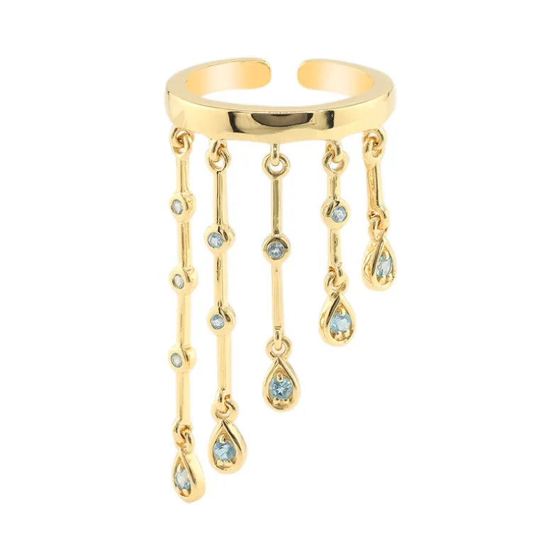 Entdecken Sie die Eleganz dieses Rings von M de Luca, der 12 Schweizer Blautopase aus Brasilien präsentiert. Die Edelsteine mit einem Gesamtkaratgewicht von 0,248 sind in 925er Sterlingsilber mit einer luxuriösen Goldplattierung gefasst. Das kaskadenförmige Design verleiht ihm einen Hauch von Eleganz und macht ihn perfekt für den Abend oder besondere Anlässe. Kombinieren Sie ihn mit Ihrem Lieblingscocktailkleid, um Ihren schicken Look zu vervollständigen.