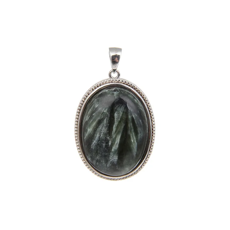 Dieser verführerische Anhänger enthüllt einen Schatz aus dem Herzen Russlands: einen ovalen Seraphinit-Cabochon von 27,3 Karat. Die fesselnden Muster des Edelsteins erinnern an ätherische Flügel, die in glänzendes 925er Sterlingsilber gefasst sind und durch die filigrane Fassung ergänzt werden. Sein majestätischer Charme ist ideal, um jedem Ensemble einen Hauch von Verzauberung zu verleihen. Dieses Schmuckstück ist perfekt für Sammler und Modebegeisterte und wird bei jeder Gelegenheit für Gesprächsstoff sorgen.