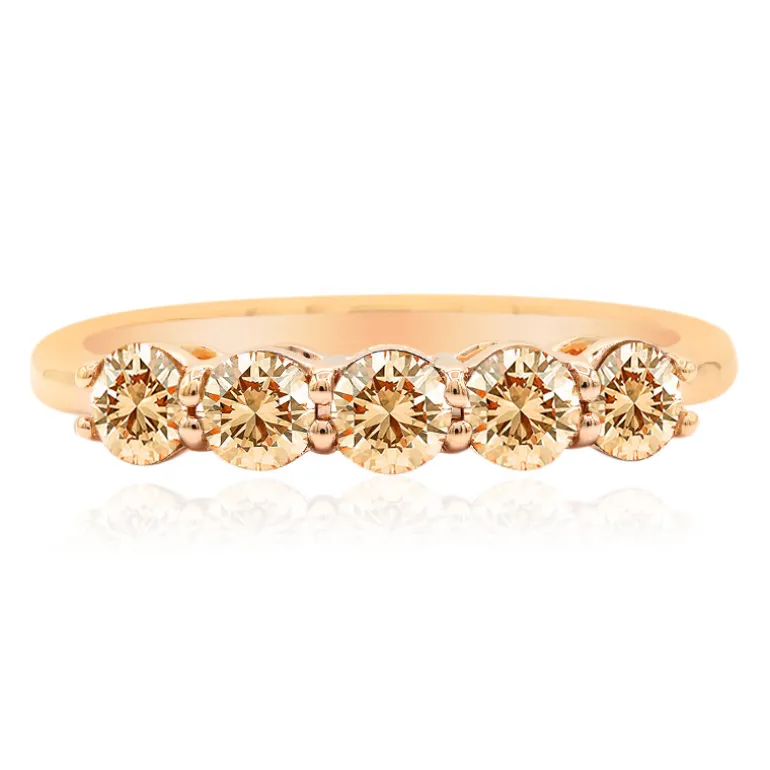 Entdecken Sie die Pracht australischer Edelsteine mit diesem exquisiten Ring aus 585er Gold, der fünf Argyle-Rose de France-Diamanten SI1 von insgesamt 0,875 ct präsentiert. Jeder Diamant ist meisterhaft in runder Brillantform geschliffen, mit einem Durchmesser von etwa 3,5 mm, und ergänzt mit seinen funkelnden Facetten perfekt die warmen, rosafarbenen Farbtöne. Die Schlichtheit des Designs sorgt für eine zeitlose Eleganz, die sich sowohl für den Alltag als auch für besondere Anlässe eignet, und die Fertigung des Rings aus hochwertigem Gold verleiht ihm einen Hauch von Luxus. Kombinieren Sie dieses raffinierte Schmuckstück mit einem zartrosa oder cremefarbenen Outfit, um den zarten rosafarbenen Schimmer zu betonen.