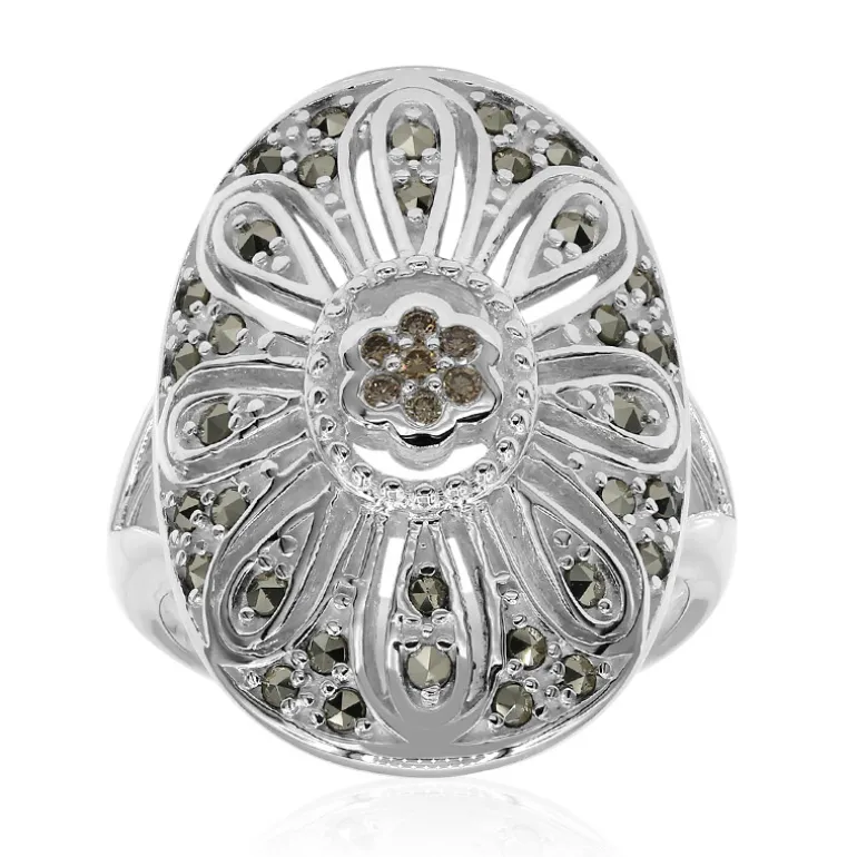 Dieser exquisite Ring aus hochwertigem 925er Sterlingsilber mit einem Gewicht von ca. 5,3 g ist ein Meisterwerk mit Vintage-Charme. Sein Herzstück sind SI1 Argyle-Rose de France-Diamanten aus den angesehenen australischen Argyle-Minen, umgeben von einer Konstellation strahlender Markasit-Edelsteine aus Rumänien. Jedes Detail ist sorgfältig ausgearbeitet, vom Brillantschliff der zentralen Diamanten bis hin zu den komplizierten Fassungen der Akzentsteine, die in einem Gesamtkaratgewicht von 0,416 ct gipfeln. Die großen Abmessungen von 22×19 mm machen ihn zu einem auffälligen Schmuckstück, das sich perfekt für besondere Anlässe eignet oder einen Hauch von Raffinesse in Ihr Alltagsoutfit bringt.