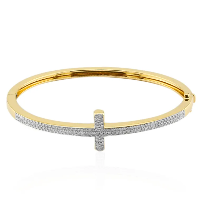 Unser exquisiter Armreif aus 14 Karat Gelbgold ist mit einem funkelnden Kreuz aus 120 Diamanten im Brillantschliff SI1 von insgesamt 0,95 Karat besetzt. Mit den Maßen 62×72 mm und einem Gewicht von ca. 19 Gramm bietet dieser elegante Armreif einen luxuriösen und dennoch bequemen Sitz. Sein zeitloses Design eignet sich sowohl für formelle Anlässe als auch für den anspruchsvollen täglichen Gebrauch. Kombinieren Sie es mit Ihrer Lieblingsuhr oder mit anderen Armbändern, um einen ganz eigenen Look zu kreieren.