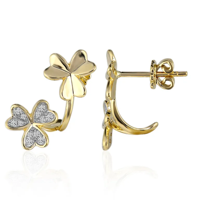 Diese zart gearbeiteten Ohrringe aus 9 Karat Gold mit dem charmanten Design eines vierblättrigen Kleeblatts bringen Glück und zeitlosen Stil. Sie sind mit 24 funkelnden Diamanten SI1 (G) mit insgesamt 0,16 Karat besetzt und verleihen jedem Ensemble einen subtilen Schimmer. Mit ihrer Größe von ca. 20 mm sitzen diese Ohrringe perfekt am Ohr und strahlen einen goldenen Schimmer aus, der sowohl für legere als auch für elegante Anlässe geeignet ist. Verbessern Sie Ihren Look von morgens bis abends mit diesem exquisiten Paar, das Luxus mit einem Hauch von Laune verbindet.
