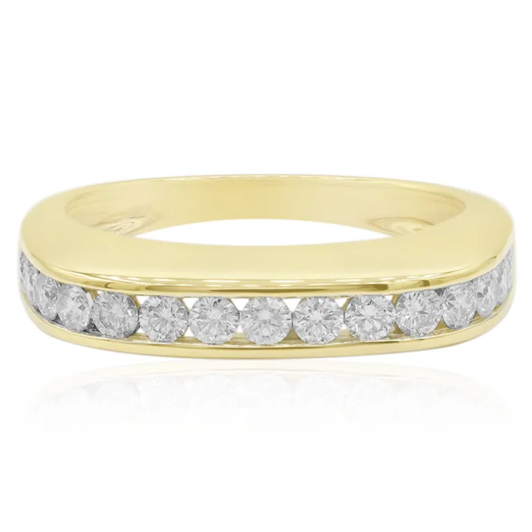 Dieser raffinierte Ring aus 9-karätigem Gold wurde mit Präzision gefertigt und ist mit einer Reihe von 15 funkelnden Diamanten der Klasse SI1 von insgesamt 0,45 Karat besetzt. Jeder Diamant ist meisterhaft in runder Brillantform geschliffen, um den Tanz des Lichts über seine Facetten zu maximieren. Er ist mit dem warmen Glanz eines 3,25-Gramm-Goldbandes eingefasst. Dieses Schmuckstück zeugt von zeitloser Eleganz und eignet sich sowohl für formelle Anlässe als auch für das tägliche Tragen. Kombinieren Sie ihn mit einer klassischen Uhr oder mit Diamantohrsteckern, um Ihr Ensemble aufzuwerten.
