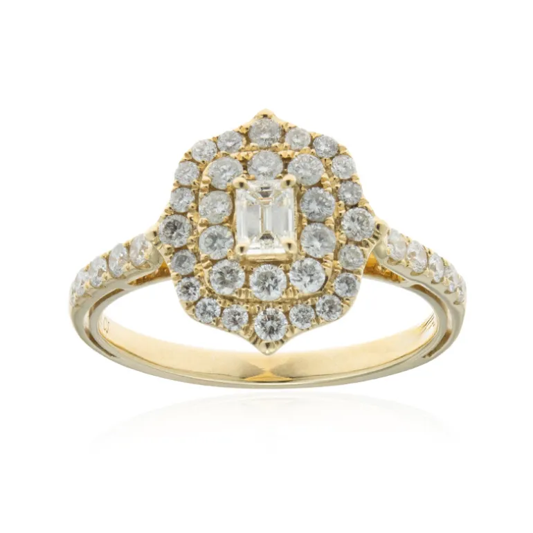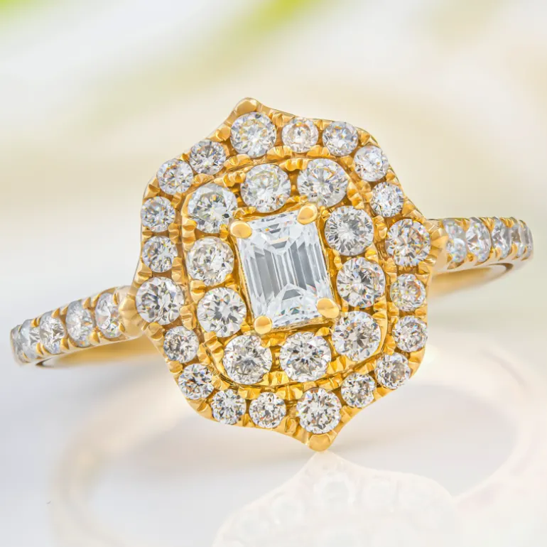 Lassen Sie sich von der zeitlosen Eleganz dieses exquisiten Rings von CIRARI verzaubern. In der Mitte des Rings befindet sich ein Diamant im Smaragd-Oktagon-Schliff (0,30 cm), der von 44 runden Brillanten (0,82 cm) umrahmt wird. Der Ring ist in glänzendem 585er Gelbgold gefasst und wiegt 3,69 g, was sowohl Haltbarkeit als auch Tragekomfort garantiert. Mit seinem filigranen Design und seinem Glanz ist er ideal für besondere Anlässe oder zur Aufwertung der Alltagskleidung.
