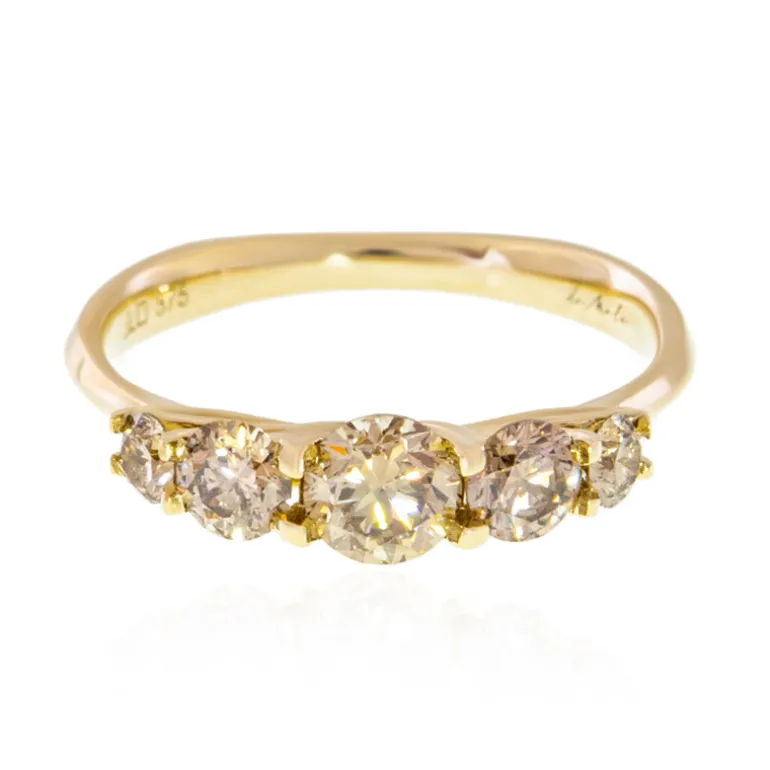 Entdecken Sie die Faszination dieses exquisiten Rings aus 9-karätigem Gold mit einer Sinfonie aus Argyle-Champagne-Diamanten aus den renommierten australischen Minen. Mit einem Gesamtkaratgewicht von 1,152 ct präsentiert dieser Ring einen zentralen Diamanten von 0,468 ct, der von weiteren Steinen unterschiedlicher Größe flankiert wird, die alle im Rundschliff geschliffen sind. Der warme, buttrige Farbton des Goldes ergänzt die funkelnden Champagnertöne und die sanften Brauntöne der Diamanten und macht diesen Ring zu einer unwiderstehlichen Wahl für Verlobungen, Jahrestage oder als zeitlose Ergänzung zu jeder Schmucksammlung. Dieses Schmuckstück glänzt nicht nur für sich allein, sondern passt auch hervorragend zu eleganter Abendgarderobe oder eleganten Freizeitoutfits.