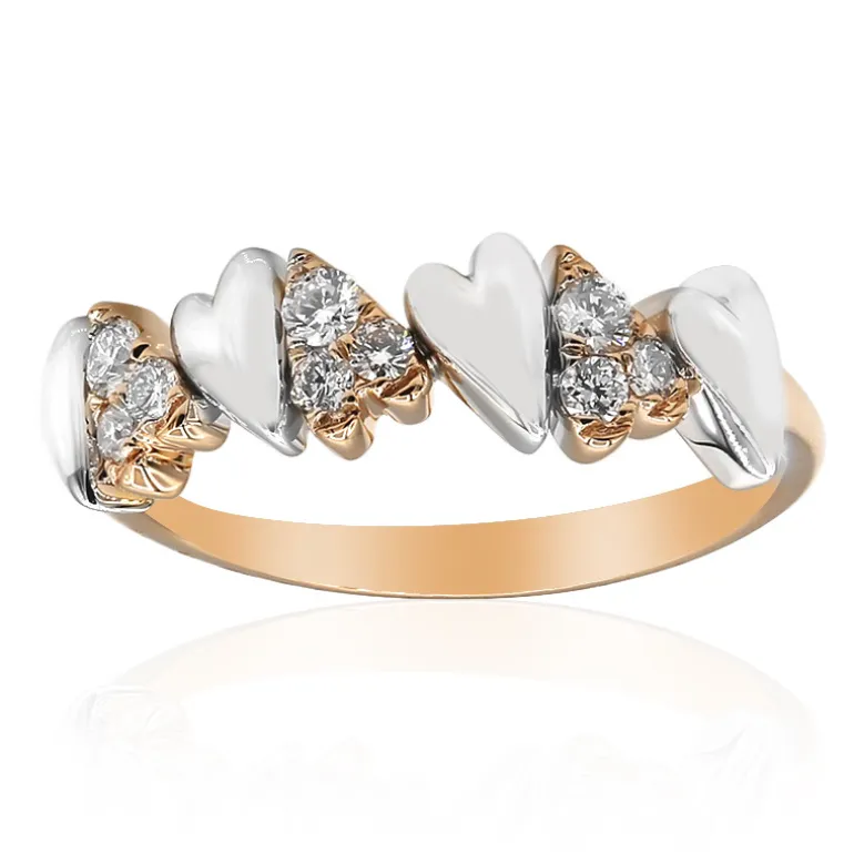 Dieser zarte Ring ist eine Sinfonie der Raffinesse mit seinem Band aus 585er Rosé- und Weißgold, das 0,254 Karat funkelnde Diamanten der Reinheit SI2 präsentiert. Das mit Edelsteinen verschlungene Herzmotiv verleiht ihm eine zusätzliche Schicht Romantik und Charme und macht ihn zu einer bezaubernden Wahl für Jubiläen oder Überraschungsgeschenke. Tragen Sie dieses filigrane Schmuckstück, um elegante Abendgarderobe aufzuwerten oder Ihrem Alltagsstil einen Hauch von Raffinesse zu verleihen.