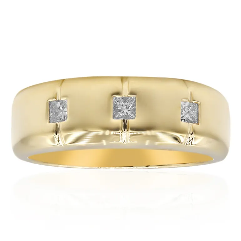 Dieser schicke und moderne Ring aus 585er Gelbgold setzt ein elegantes Statement. Mit einem Trio von Diamanten im Princess-Schliff der Reinheit SI2 und Farbe H von insgesamt 0,366 Karat fängt jeder Stein das Licht mit seinem einzigartigen Funkeln ein. Das 7,63 g schwere Goldband bietet dauerhafte Qualität und eine bequeme Passform. Perfekt für besondere Anlässe oder als hervorstechendes Stück in einer anspruchsvollen Garderobe.
