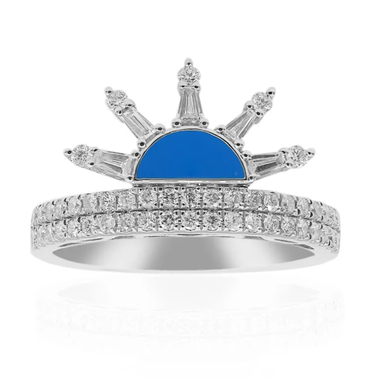 Entdecken Sie die Essenz der Eleganz mit diesem auffälligen Ring aus 18 Karat Weißgold, der mit einer blauen Edelsteinkrone verziert ist. Das Herzstück wird von 47 Diamanten im SI2 (H) Brillant-Rundschliff mit einem Gesamtgewicht von 0,389 ct eingerahmt und von 5 Diamanten im Fancy-Schliff mit einem Gewicht von 0,13 ct akzentuiert. Das königliche Band mit einem Gewicht von ca. 3,81 g ist aufwendig verziert und unterstreicht seinen strahlenden Charme. Dieses exquisite Schmuckstück von CIRARI eignet sich perfekt für elegante Anlässe und setzt bei jeder Gelegenheit ein großes Zeichen.