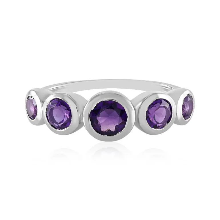 Dieser bezaubernde Ring besteht aus einem Quintett sibirischer Amethyste von insgesamt 1,889 Karat, die elegant auf platiniertem 925er Sterlingsilber gefasst sind. Jeder Edelstein ist sorgfältig rund geschliffen und zeigt tiefe violette Farbtöne, die an den reichen sibirischen Himmel erinnern. Das Design ist eine wunderbare Mischung aus modernem Charme und klassischer Eleganz, ideal sowohl für zwanglose Ausflüge als auch für formelle Anlässe. Dieser Ring passt perfekt zu einem Cocktailkleid oder als Farbtupfer zu Ihrer Bürokleidung und ist eine vielseitige Ergänzung für jede Schmucksammlung.