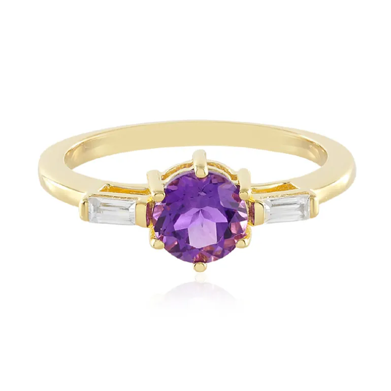 Dieser atemberaubende Ring mit sibirischem Amethyst schmückt Ihre Hand mit der Lebendigkeit des russischen Winters. Der zentrale Edelstein im Rundschliff mit einem Gewicht von 1,123 Karat ist in glänzend vergoldetem 925er Sterlingsilber gefasst und besticht durch seinen tiefvioletten Farbton, der durch zwei kambodschanische Zirkon-Baguetten ergänzt wird, die einen Hauch von Brillanz verleihen. Mit einem Gesamtkaratgewicht von 1,427 Karat verbindet dieses Schmuckstück moderne Eleganz mit einem klassischen Touch. Es eignet sich sowohl für einen legeren Brunch als auch für eine Gala am Abend und verspricht eine vielseitige Ergänzung Ihrer Schmucksammlung zu werden.