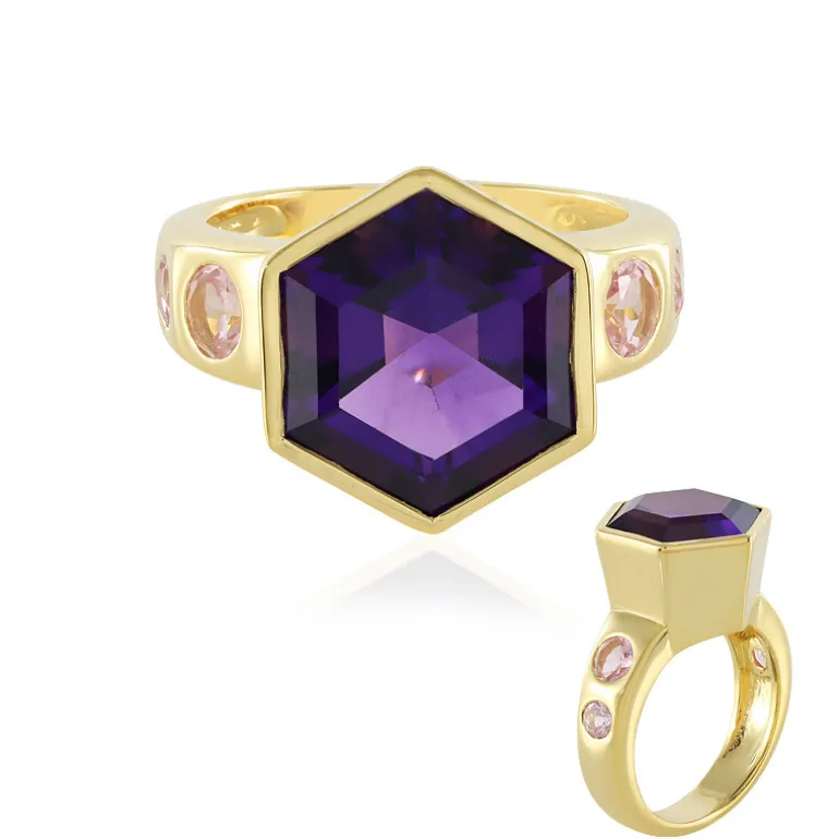 Entdecken Sie die majestätische Anziehungskraft dieses Rings mit sibirischem Amethyst im Sechseckschliff, gekrönt von nigerianischen rosa Turmalinen. Dieses raffinierte Schmuckstück enthält einen atemberaubenden 6,363 Karat schweren, tiefvioletten Amethysten aus den berühmten Lagerstätten Russlands, der durch den warmen Glanz von vergoldetem 925er Sterlingsilber ergänzt wird. Mit einem Edelsteingewicht von insgesamt 7,088 Karat ist er eine wertvolle Ergänzung für jede Sammlung. Dieser Ring ist ideal für die Abendgarderobe oder besondere Anlässe und verspricht, Ihrer Kleidung einen Hauch von Raffinesse zu verleihen.