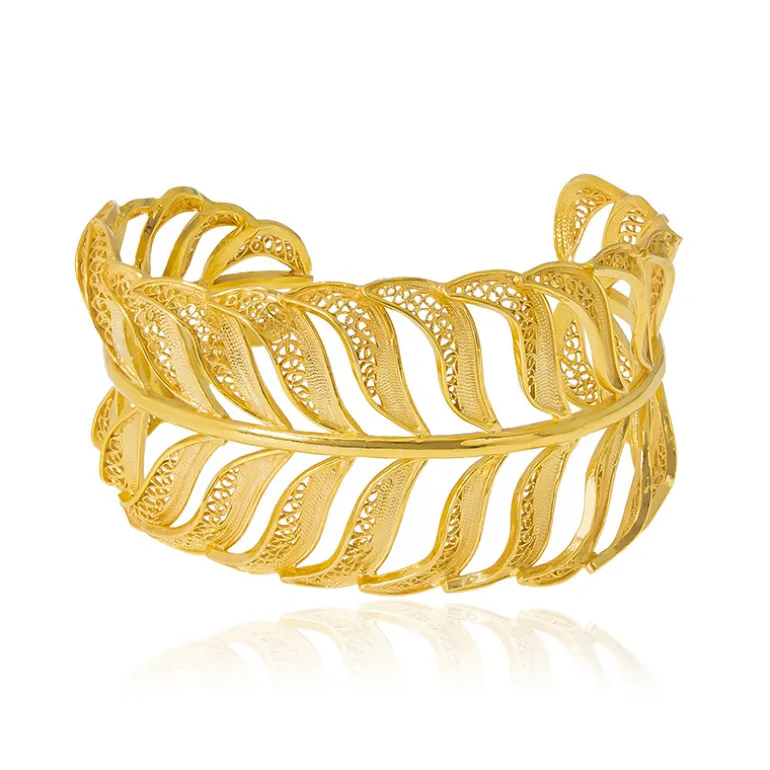 Eleganz mit unserem Golden Feather Sterling Silver Armreif. Gefertigt aus 925er Sterlingsilber und fachmännisch vergoldet, bietet dieser Armreif einen luxuriösen Glanz und ein kompliziertes Federdesign. Mit einem Gewicht von ca. 32 g ist er ein Highlight für jede Gelegenheit. Dieser Armreif lässt sich ideal mit Abendgarderobe oder einem schicken Outfit kombinieren und verleiht Ihrem Stil einen raffinierten Touch.