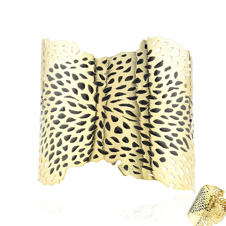 Hier kommt unsere auffällige Manschette, die sorgfältig aus 925er Sterlingsilber gefertigt und für ein opulentes Finish aufwendig vergoldet wurde. Mit einem Gewicht von ca. 25,7 Gramm und einem filigranen Cutout-Muster erinnert dieses Stück an exotische Spitzenarbeiten. Die großzügigen Abmessungen von 64×56 mm sorgen für einen komfortablen und dennoch auffälligen Auftritt an Ihrem Handgelenk. Diese Manschette eignet sich sowohl für den lässigen Chic als auch für die Eleganz des Abends. Sie ist das Herzstück jedes Outfits und zieht bei jeder Gelegenheit die Blicke auf sich.