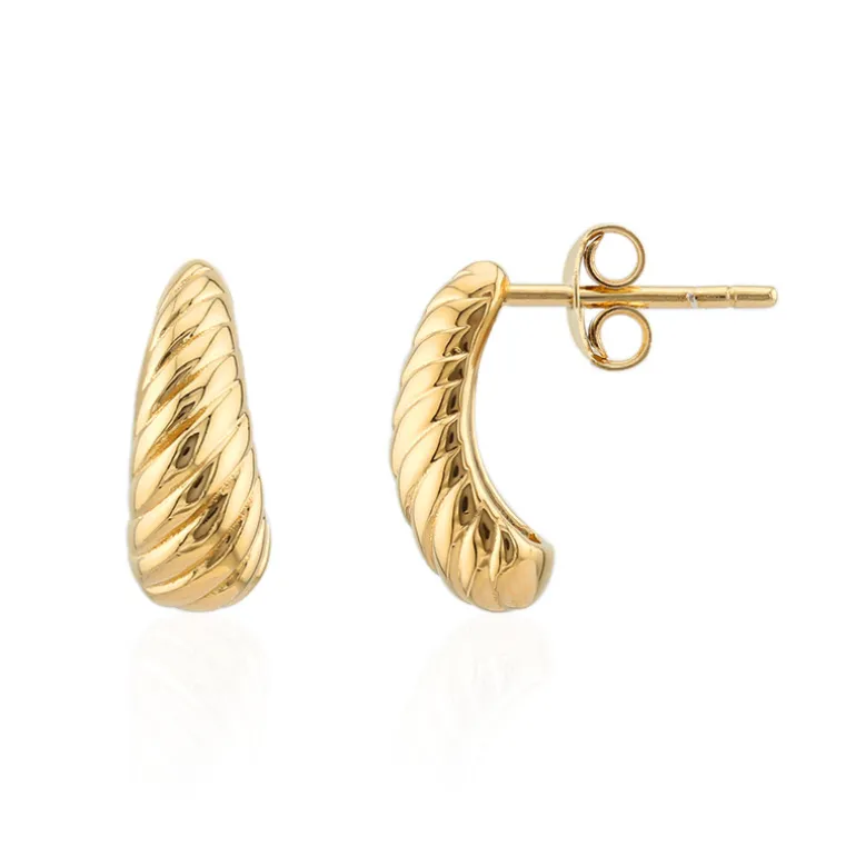 Hier kommen unsere Feathered Glamour Ohrringe, bei denen Raffinesse auf modernes Design trifft. Diese auffälligen Schmuckstücke sind aus hochwertigem 925er Sterlingsilber gefertigt und mit einer glänzenden Goldplattierung verziert. Sie wiegen ca. 2,63 Gramm. Das einzigartige Federmuster verleiht ihnen einen Hauch von Eleganz und macht sie zu einem unverzichtbaren Accessoire für jede modische Garderobe. Sie eignen sich sowohl für einen legeren Brunch als auch für formelle Abendveranstaltungen und verleihen jedem Outfit einen Hauch von Luxus und Stil.