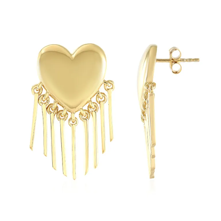 Entdecken Sie die Anziehungskraft dieser schicken Herzohrringe aus vergoldetem Sterlingsilber. Sie sind 32 mm groß und haben ein fesselndes Herzdesign, das mit einer Kaskade eleganter goldener Quasten verziert ist. Jeder Ohrring ist fachmännisch aus 925er Sterlingsilber mit einer polierten Goldplattierung gefertigt und verleiht jedem Ensemble einen Hauch von Raffinesse. Perfekt für romantische Abende oder als Statement-Accessoire für den Tag, sind diese Ohrringe ein Zeugnis der Liebe und Mode kombiniert.
