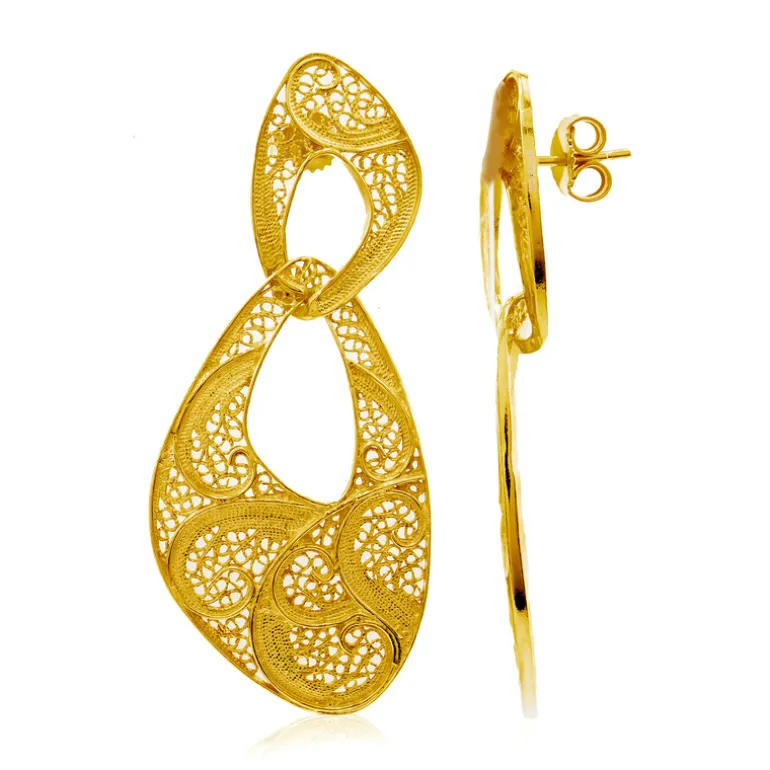 Wir präsentieren unsere lebhaften Ohrringe aus 925er Sterlingsilber mit einer luxuriösen Goldbeschichtung. Diese 55 mm großen Schmuckstücke strahlen Eleganz und Raffinesse aus und eignen sich sowohl für legere als auch für formelle Anlässe. Kombinieren Sie sie mit einem eleganten Abendkleid oder einer schicken Bluse, um Ihren Stil zu unterstreichen. Diese Schmuckstücke sind ideal für alle, die Kunstfertigkeit zu schätzen wissen, und stellen eine atemberaubende Ergänzung für jede Sammlung dar.