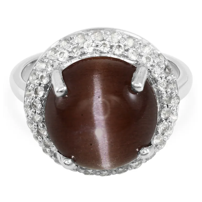 Dieser bezaubernde Ring zeigt einen 7,79 Karat großen, polierten brasilianischen Katzenaugen-Skapolit-Cabochon, der von 56 weißen Topasen im Rundschliff mit einem Gesamtgewicht von 1,03 Karat umgeben ist. In 925er Sterlingsilber gefasst, verbindet das Schmuckstück den geheimnisvollen Schimmer des Katzenauges mit dem Funkeln des Topas. Das Zusammenspiel der warmen Brauntöne mit dem eisigen Glanz der Silberfassung macht ihn zu einer vielseitigen Wahl, die sich sowohl für den eleganten Alltag als auch für die elegante Abendgarderobe eignet.
