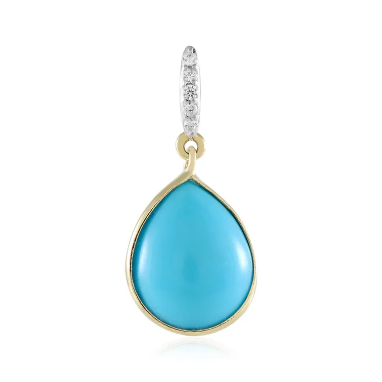 Entdecken Sie die Faszination dieses exquisiten Anhängers mit Dornröschen-Türkis aus den USA. Er ist in 375er Gelbgold gefasst und zeigt einen birnenförmigen Cabochon, der durch kambodschanische Zirkon-Akzente ergänzt wird. Er ist ideal, um jedem Outfit einen Hauch von Blau zu verleihen, und eignet sich perfekt für elegante Veranstaltungen oder legere Ausflüge. Machen Sie diesen Anhänger zum Herzstück Ihrer Schmucksammlung.
