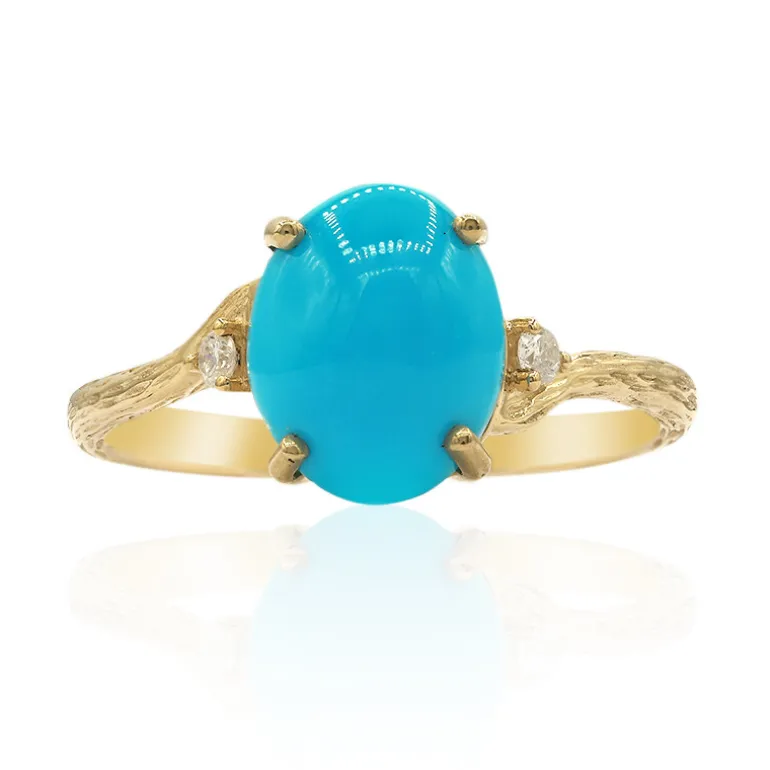 Dieser Ring ist eine fesselnde Kombination aus Eleganz und Anziehungskraft. Der ovale Cabochon Sleeping Beauty Türkis aus Arizona mit einem Gewicht von 2,34 Karat wird von zwei Diamanten mit insgesamt 0,055 Karat eingerahmt. Die harmonische Fassung aus 14-karätigem Gelbgold mit einem Gewicht von ca. 2,06 g ergänzt wunderbar den leuchtenden Türkiston. Dieser Ring ist ideal für verschiedene Anlässe, denn er strahlt Raffinesse aus und kann einem neutralen oder weißen Ensemble einen Hauch von lebendiger Farbe hinzufügen, um einen gehobenen Look zu erzielen.