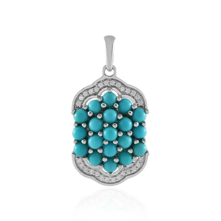 Entdecken Sie die Eleganz dieses Dornröschen-Türkis-Anhängers aus 925er Sterlingsilber. Er besteht aus 19 Türkisen im Cabochon-Schliff aus den USA, die von 28 funkelnden Zirkonen aus Kambodscha ergänzt werden. Dieser Anhänger ist ideal, um jedem Outfit einen farbigen Akzent zu verleihen. Er eignet sich sowohl für legere als auch für formelle Anlässe und bietet einen zeitlosen Reiz, der die Jahreszeiten überdauert.