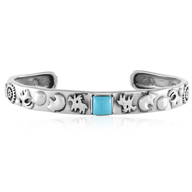 Erleben Sie den Reiz der Wüste des Südwestens mit diesem exquisiten Silberarmreif. Der bezaubernde Dornröschen-Türkis aus den USA sitzt mit seinem Carré-Cabochon-Schliff elegant in der Mitte. Das mit einzigartigen Motiven verzierte Sterlingsilber verleiht ihm eine schicke, künstlerische Note. Dieses Schmuckstück eignet sich sowohl für lässige Ausflüge als auch für exotische Abenteuer am Abend und ergänzt mühelos den Bohème-Stil.