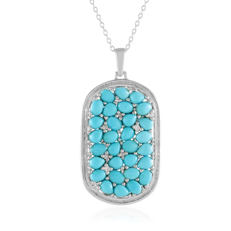 Diese atemberaubende Halskette besteht aus exquisiten Dornröschen-Türkisen aus den USA, die durch funkelnde Zirkone aus Tansania wunderbar ergänzt werden. Der Anhänger aus platiniertem 925er Sterlingsilber ist 39×20 mm groß und hängt an einer 45,5-50,5 cm langen Kette. Dieses Schmuckstück ist ideal, um jedem Outfit einen Hauch von Eleganz zu verleihen, und eignet sich sowohl für den Alltag als auch für besondere Anlässe. Kombinieren Sie ihn mit einem schlichten Kleid oder einer Bluse, um seine leuchtende Farbe erstrahlen zu lassen.