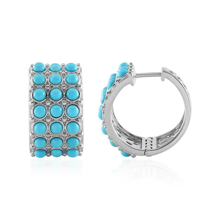 Entdecken Sie die Faszination des amerikanischen Dornröschen-Türkises mit diesen bezaubernden Creolen. Das aus 925er Sterlingsilber gefertigte und mit einer luxuriösen Platinbeschichtung versehene Paar besticht durch 42 runde Cabochon-Türkissteine von insgesamt 4,662 Karat. Mit ihrem ruhigen himmelblauen Farbton, der zeitlose Eleganz ausstrahlt, eignen sich diese Ohrringe sowohl für legere als auch für formelle Anlässe und verleihen Ihrem Ensemble einen vielseitigen Charme.
