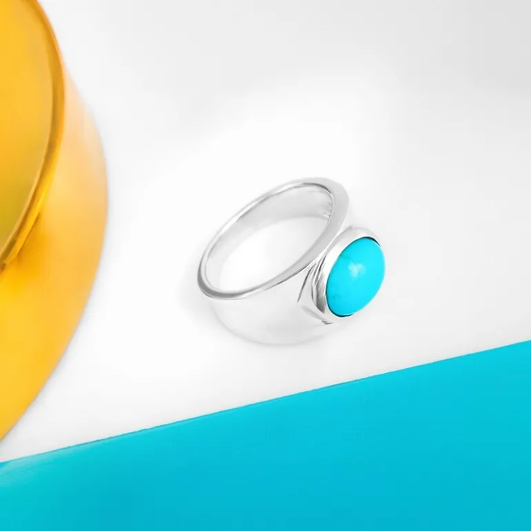 Entdecken Sie die heitere Schönheit dieses mit einem ovalen Cabochon-Stein aus 925er Sterlingsilber verzierten Rings mit Dornröschen-Türkis aus den USA. Sein bezaubernder rotkehlchenblauer Farbton wird durch ein schlichtes und doch modernes Design ergänzt und wiegt etwa 6,42 g. Der Ring ist ideal, um im Alltag einen Farbakzent zu setzen oder bei besonderen Anlässen einen glänzenden Auftritt hinzulegen.