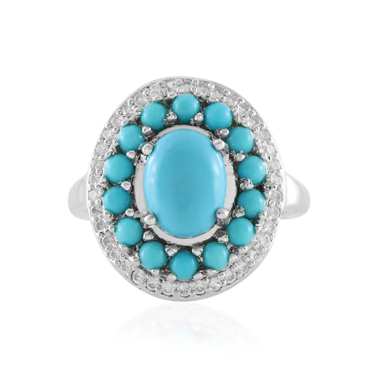 Entdecken Sie die Faszination des amerikanischen Türkis mit diesem eleganten Ring aus Sterlingsilber. Der ovale Dornröschen-Türkis mit einem Gewicht von 1,494 Karat ist von einem bezaubernden Kranz aus passenden runden Cabochons mit einem Gesamtgewicht von 0,873 Karat umgeben. Mit 0,459 ct kambodschanischen Zirkon-Akzenten hat dieses Schmuckstück ein Gesamtgewicht von 2,826 ct. Das Design versprüht Vintage-Charme und eignet sich perfekt, um Ihrem Outfit einen Hauch von Farbe zu verleihen. Egal, ob Sie sich für einen besonderen Anlass herausputzen oder Ihr tägliches Outfit akzentuieren, dieser Ring wird für Gesprächsstoff sorgen.