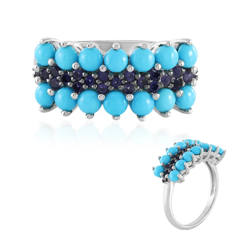 Entdecken Sie die lebhafte Eleganz dieses Rings aus Sterlingsilber, der mit dem kultigen Dornröschen-Türkis und dunklen Iolithen verziert ist. Die bezaubernden azurblauen Farbtöne des Türkises von insgesamt ca. 1,638 Karat stehen in exquisitem Kontrast zu den 0,301 Karat violett gefärbten Madagaskar-Iolithen, die dieses Schmuckstück zu einem Juwel von exquisiter Farbe und Design machen. Die Struktur des Rings aus runden Cabochon-Türkisen inmitten von funkelnden Iolithen im Rundschliff, gefasst in platiniertem Silber, ist ein Beispiel für moderne Raffinesse. Er ist ideal, um einem einfarbigen Outfit einen Farbakzent zu verleihen oder einen Boho-Chic-Look zu ergänzen, und ist ein vielseitiges Accessoire für jeden Anlass.