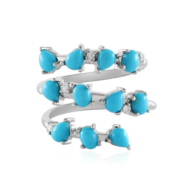 Entdecken Sie die Faszination des Sleeping Beauty Türkis Silberrings. Dieses exquisite Schmuckstück präsentiert 11 Türkiscabochons in ovaler und tropfenförmiger Form aus den USA mit insgesamt 1,62 Karat. Er glänzt in platiniertem Sterlingsilber und wird durch tansanische Zirkone akzentuiert. Er eignet sich sowohl für legere als auch für elegante Anlässe und passt sowohl zur Tages- als auch zur Abendgarderobe, wobei er einen kräftigen Farbtupfer setzt.