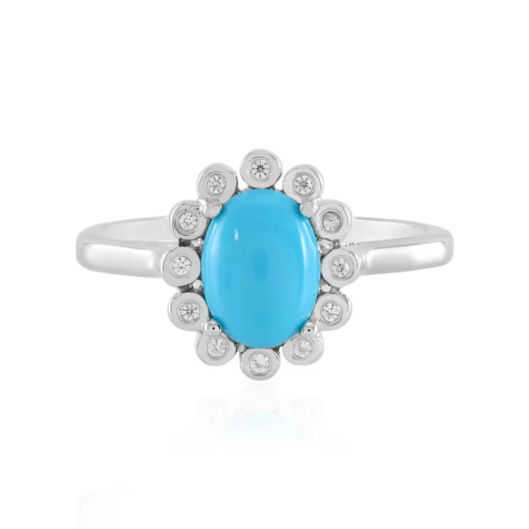 Entdecken Sie die Anziehungskraft dieses atemberaubenden Rings mit einem ovalen Cabochon aus Dornröschen-Türkis, der von funkelnden Zirkonsteinen umrahmt wird. Dieses exquisite Schmuckstück besteht aus einem 0,981 Karat schweren Türkis aus den USA, der von einem 0,81 Karat schweren, schillernden Zirkon aus Tansania ergänzt wird. In platiniertem 925er Sterlingsilber gefasst, beträgt das Gesamtgewicht der Edelsteine 1,791 Karat. Ein perfektes Accessoire, das sowohl tagsüber als auch abends für Eleganz sorgt. Kombinieren Sie ihn mit einer knackigen weißen Bluse oder einem fließenden Abendkleid, um jedes Ensemble aufzuwerten.