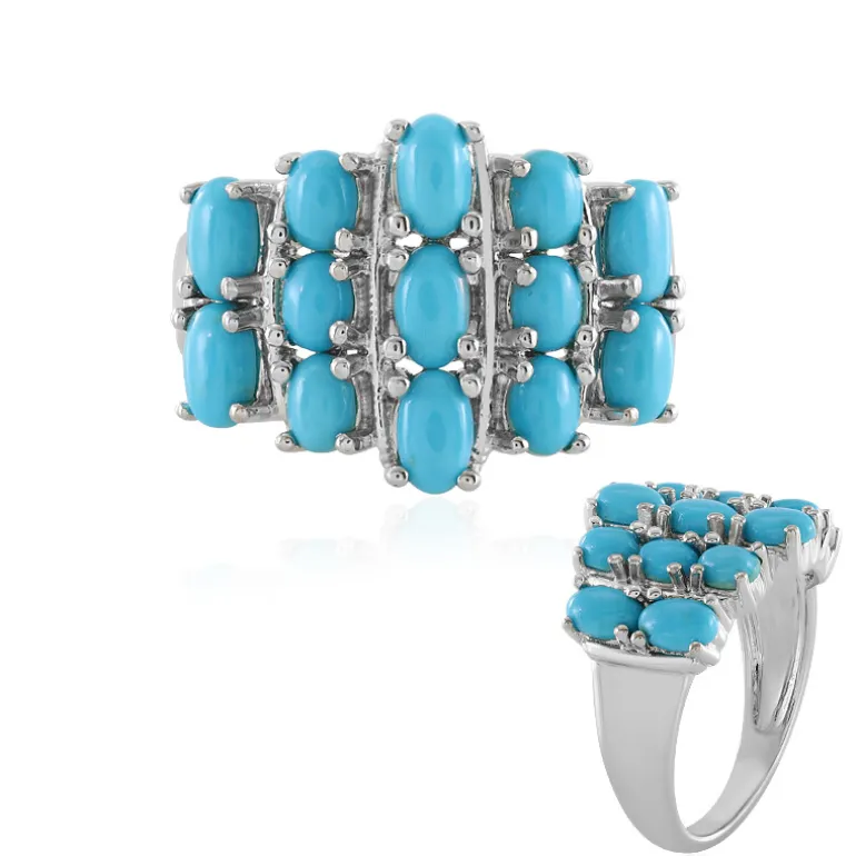Entdecken Sie die Faszination des amerikanischen Südwestens mit diesem bezaubernden Ring, der den legendären Dornröschen-Türkis präsentiert. Dreizehn ovale Cabochons mit einem Gesamtgewicht von 2,389 Karat sind elegant in platiniertes 925er Sterlingsilber gefasst. Der leuchtende Cyan-Farbton des Türkises bildet einen schönen Kontrast zu dem glatten Metallfinish und schafft so ein auffälliges Accessoire, das sowohl modern als auch zeitlos ist. Dieser Ring eignet sich perfekt, um Ihrem Outfit einen farbenfrohen Akzent zu verleihen und ist sowohl für den eleganten Tag als auch für den eleganten Abend geeignet.