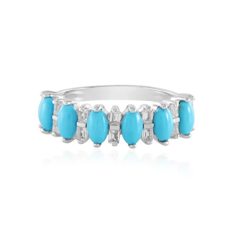 Entdecken Sie die fesselnde Anziehungskraft dieses schicken Dornröschen-Türkis-Silberrings, ein Schatz mit 6 ovalen Cabochons aus Arizonas wertvollem Türkis mit einem Gesamtgewicht von 1,121 Karat. Diese bezaubernde Kreation wird durch 14 brasilianische weiße Topas-Baguetten veredelt, die einen zusätzlichen Glanz verleihen. Das 925er Sterlingsilberband, das für Langlebigkeit und Glanz plattiert ist, hält jeden Edelstein elegant an seinem Platz. Dieser Ring eignet sich sowohl für legere Ausflüge als auch für elegante Abende und ist eine vielseitige Ergänzung für jede Garderobe.