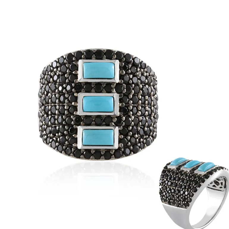 Dieser atemberaubende Silberring zeigt die Anziehungskraft des Dornröschen-Türkises, der elegant mit einem Kontrast aus schwarzen Spinellen besetzt ist. Das Design aus platiniertem 925er Sterlingsilber besteht aus drei bezaubernden Türkissteinen, die von 122 schwarzen Spinellen umgeben sind und so einen eindrucksvollen optischen Eindruck hinterlassen. Dieses Schmuckstück ist perfekt für besondere Anlässe oder um alltäglichen Outfits eine einzigartige Note zu verleihen und verbindet mühelos Eleganz mit kühnem Stil.
