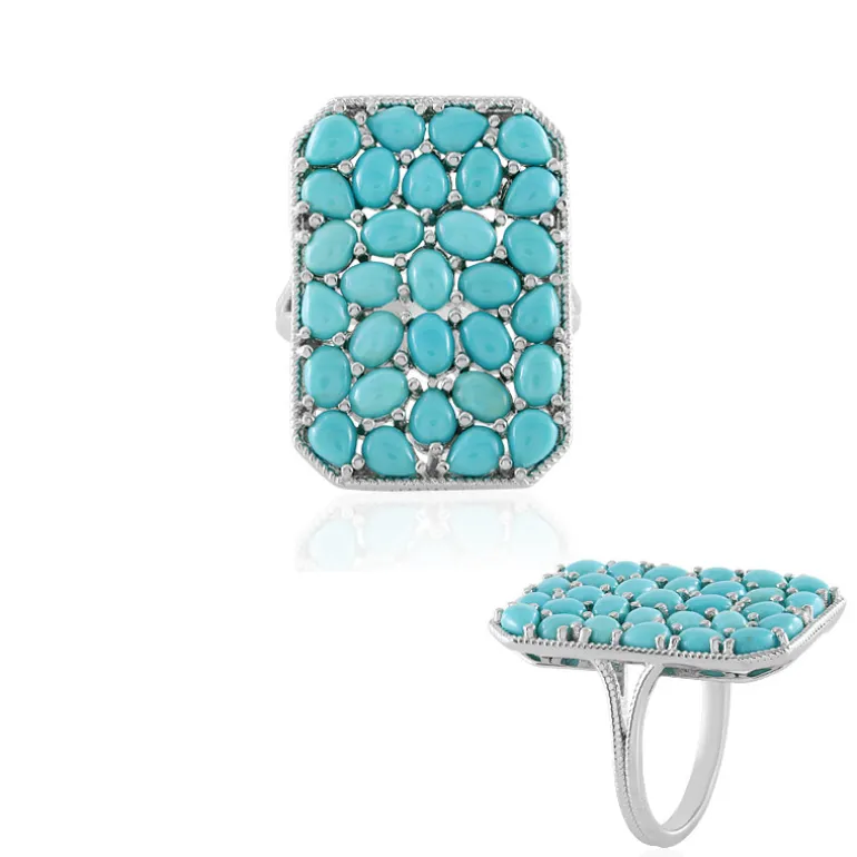 Entfalten Sie den Charme des legendären Dornröschen-Türkises mit diesem exquisiten Ring aus platiniertem Sterlingsilber. Mit 30 ovalen und tropfenförmigen Cabochons von insgesamt 4,8 Karat fängt dieses Schmuckstück den fesselnden himmelblauen Farbton ein, der Schmuckliebhaber auf der ganzen Welt verzaubert hat. Mit seinen Maßen von 21×20 mm und seinem detaillierten Design ist dieser Ring ein Blickfang für jedes Ensemble. Er ist ideal, um Ihrem Outfit einen Hauch von heiterer Eleganz zu verleihen, und eignet sich sowohl für legere Brunchs als auch für formelle Abende. Kombinieren Sie ihn mit sanften Pastelltönen oder kontrastierenden dunklen Farben, um das leuchtende Türkis hervorzuheben.
