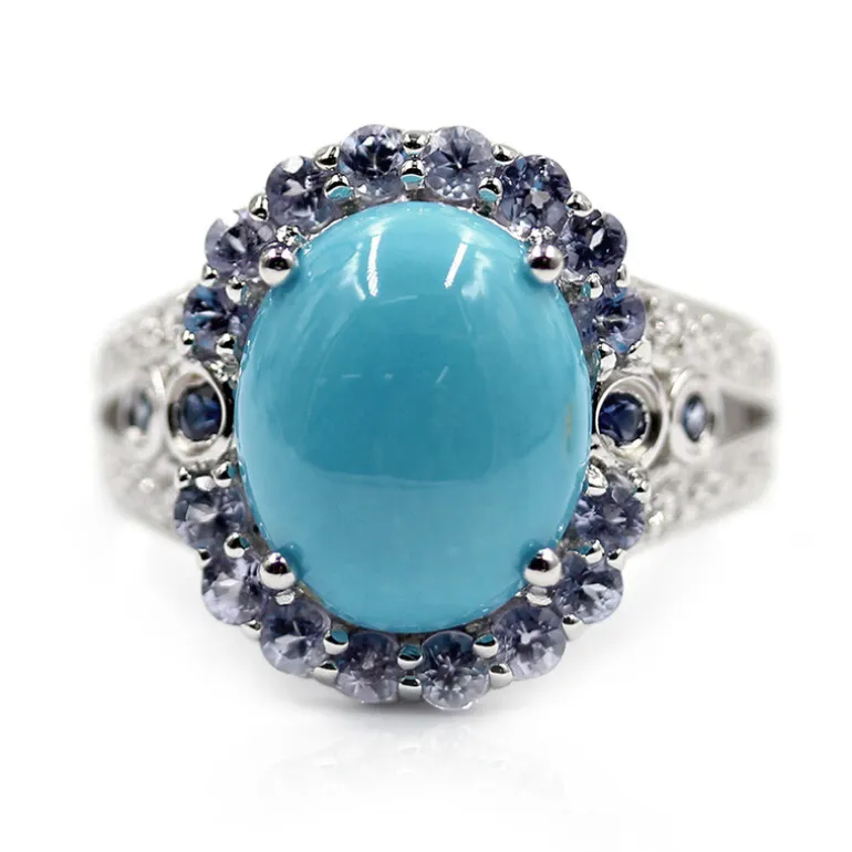 Tauchen Sie ein in die heitere Schönheit dieses exquisiten Rings aus Sterlingsilber mit einem bezaubernden Dornröschen-Türkiscabochon aus den USA. Eingerahmt von einem Halo aus Tansaniten im Rundschliff mit einem Gesamtgewicht von 0,619 ct aus Tansania und akzentuiert mit glitzernden Ceylon-Saphiren und Zirkonen, wiegt dieses Schmuckstück insgesamt beeindruckende 3,913 ct. Die Platinplattierung verleiht dem gesamten Design einen Hauch von Luxus. Dieser Ring ist perfekt, um Ihrem Ensemble einen Farbtupfer zu verleihen, und eignet sich sowohl für lässige Brunchs als auch für elegante Abendveranstaltungen.