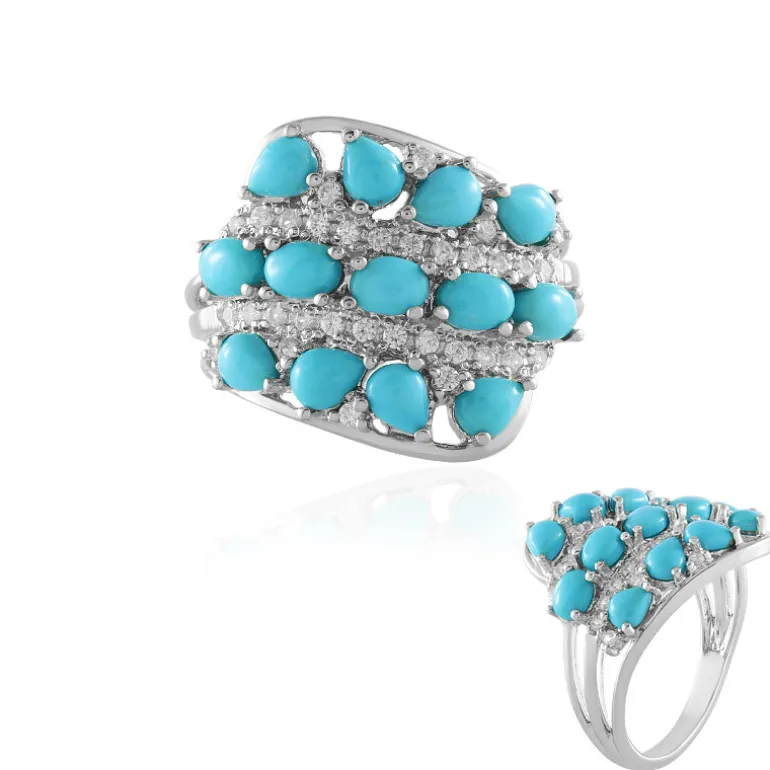 Entdecken Sie die Anziehungskraft des Sleeping Beauty Turquoise Silver Ring. Dieser Ring aus glänzendem 925er Sterlingsilber ist mit leuchtenden Türkis-Cabochons und schimmernden Zirkonen aus Tansania besetzt. Er ist ideal, um jedem Ensemble einen farbigen Akzent zu verleihen und passt sowohl zu legerer als auch zu formeller Kleidung. Perfekt, um bei besonderen Anlässen ein schickes Statement abzugeben oder den Alltagslook aufzuwerten.