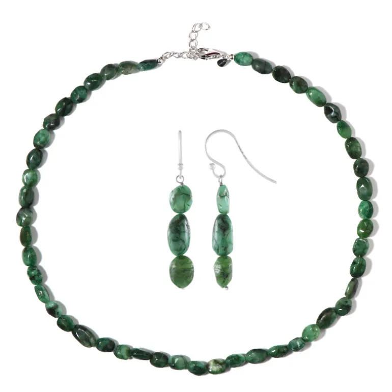 Dieses exquisite Schmuckset besteht aus einer auffälligen Kombination von Socoto-Smaragdperlen in einem 42 mm großen Ohrringpaar und einer 45-48,5 cm langen Halskette aus 925er Sterlingsilber. Dieses Set ist ideal für alle, die die satten Grüntöne natürlicher Edelsteine schätzen und verleiht jedem Outfit einen Hauch von Eleganz. Perfekt für Abendveranstaltungen oder Freizeitkleidung, kombiniert mit einem schwarzen Kleid oder einer weißen Bluse, um die Smaragde zur Geltung zu bringen.