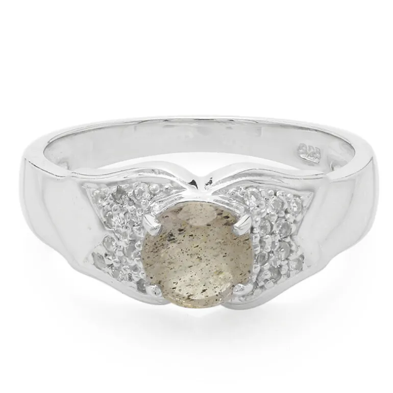 Entdecken Sie die Eleganz dieses exquisiten Spektrolith-Rings, der einen 0,58 Karat großen Edelstein im Rundschliff aus Rumänien präsentiert. Dieser Ring aus 925er Sterlingsilber wird von 20 brasilianischen weißen Topasen akzentuiert und glänzt mit Raffinesse. Er eignet sich sowohl für formelle Anlässe als auch für den Alltag und lässt sich für einen Hauch von Glamour mit Ihrem Lieblingsoutfit kombinieren.