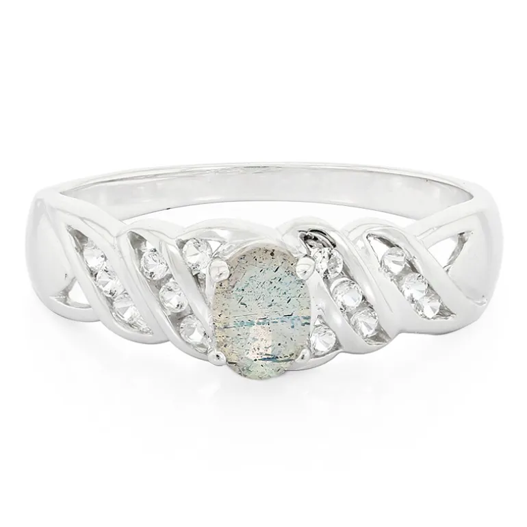 Entdecken Sie die Anziehungskraft dieses Rings mit rumänischem Spektrolith, einem Juwel der Natur, gefasst in 925er Sterlingsilber. Mit seinem ovalen Mittelstück von 0,35 Karat, umgeben von 14 leuchtenden weißen Topasen von insgesamt 0,166 Karat, ist dieser Ring ein Zeugnis der Eleganz. Jeder Edelstein ist sorgfältig in ein 23×20 mm großes Design gefasst, das bei jeder Geste das Licht reflektiert. Dieses Schmuckstück verwandelt ein legeres Ensemble in ein auffälliges Outfit oder verleiht einer Abendgarderobe den letzten Schliff. Es eignet sich für alle Gelegenheiten und ist eine vielseitige Ergänzung für jede Schmucksammlung.