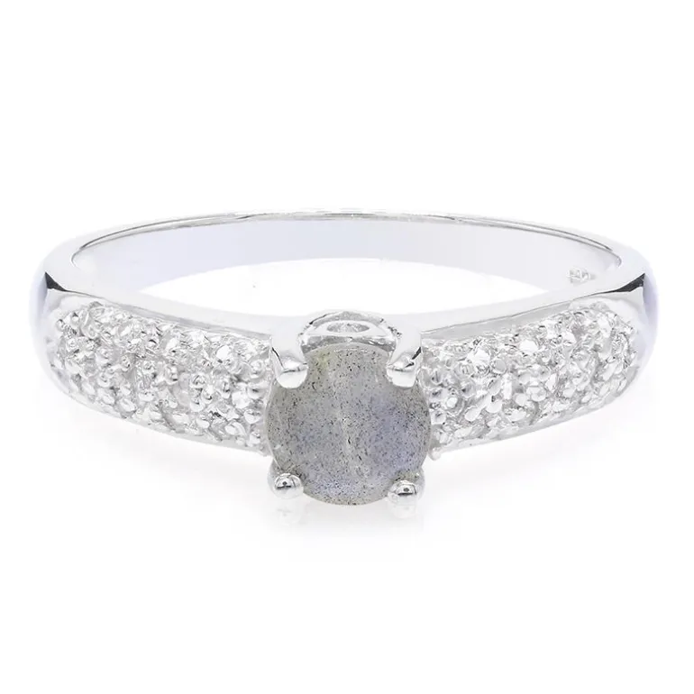 Entdecken Sie die Eleganz dieses Spektrolith-Silberrings mit einem runden Spekrolith von 0,52 Karat aus Rumänien. Dieses Schmuckstück aus 925er Sterlingsilber wird von 26 schillernden weißen Topasen aus Brasilien akzentuiert und strahlt Raffinesse aus. Er ist ideal für Abendveranstaltungen oder den täglichen Gebrauch und verleiht jedem Outfit einen Hauch von Glanz.