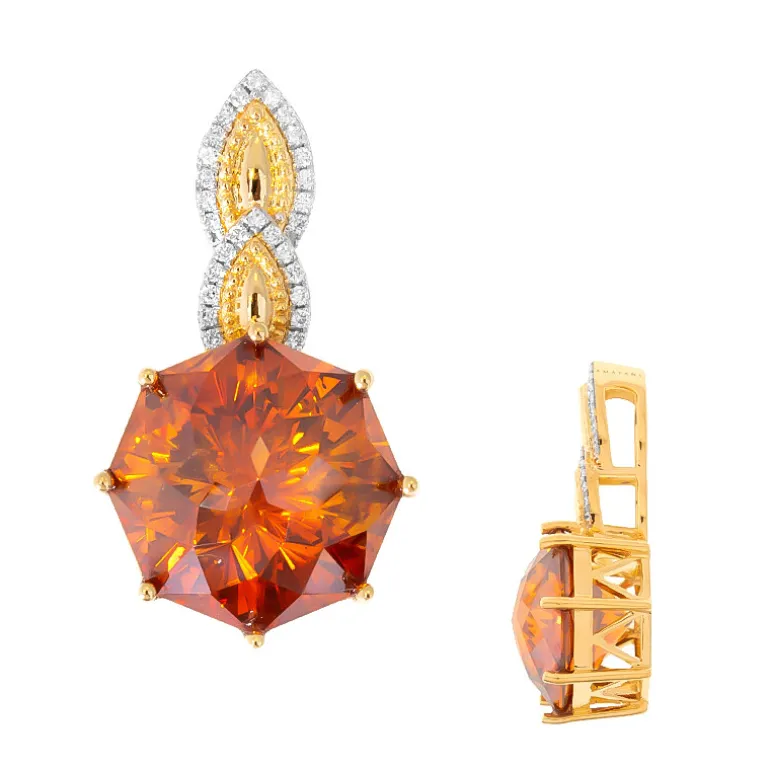 Entdecken Sie den feurigen Glanz dieses Anhängers aus spanischem Sphalerit (20,66 ct), der sorgfältig in einer Fassung aus 750er Gelbgold (18 Karat) gefertigt wurde. Der achteckig geschliffene Edelstein ist von 0,164 ct funkelnden Diamanten der Reinheit SI2 umgeben und besticht durch seine leuchtend orangen Farbtöne. Mit einer Größe von ca. 33 x 18 mm ist dieses AMAYANI-Stück ein Zeugnis exquisiter Handwerkskunst. Er ist ideal für besondere Anlässe oder um Ihrer Alltagskleidung einen Hauch von Eleganz zu verleihen.
