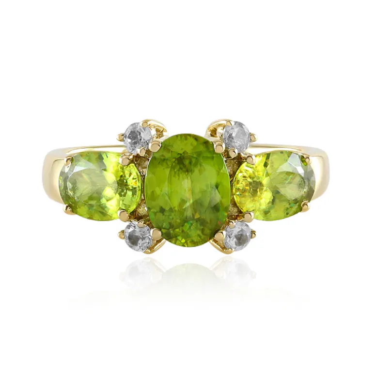 Entdecken Sie die Faszination dieses prächtigen Madagaskar-Sphäenrings, der von drei Steinen im Ovalschliff mit einem Gesamtgewicht von 2,524 ct gekrönt und von einem kambodschanischen Zirkon mit einem Gewicht von 0,38 ct akzentuiert wird. Die auffälligen Grüntöne sind elegant in 9K-Gold mit einem ungefähren Gewicht von 2,09 g eingefasst und machen ihn zu einer exquisiten Ergänzung für jede Sammlung. Dieser Ring ist perfekt, um sowohl im Alltag als auch bei besonderen Anlässen einen Farbtupfer zu setzen. Er wird Bewunderung hervorrufen und Anfragen zu seinem einzigartigen Edelstein und seiner Herkunft hervorrufen.