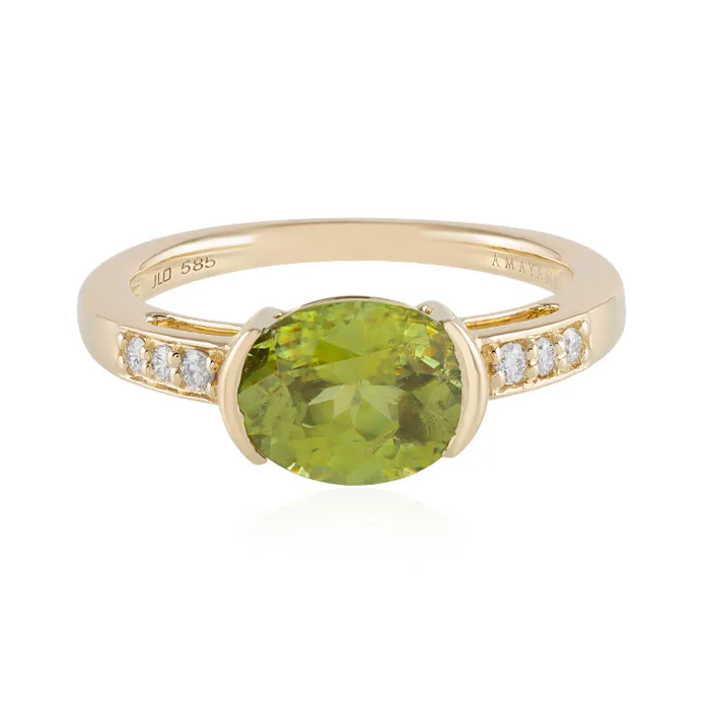 Lassen Sie sich von der üppigen grünen Eleganz dieses AMAYANI Madagaskar-Sphen-Rings mit einem ovalen Brillanten von 2,85 Karat in der Mitte begeistern. Sechs funkelnde SI1(H)-Diamanten von insgesamt 0,124 ct. umgeben die Kugel in einer sich gegenseitig verstärkenden Umarmung und verleihen ihr einen Hauch von Strahlkraft. Dieser Ring aus 14 Karat Gelbgold mit einem Gewicht von ca. 4,14 g ist sowohl luxuriös als auch zeitlos. Die große Fläche von 27×24 mm sorgt dafür, dass Ihre Hand nicht unbemerkt bleibt, während das raffinierte Design ihn sowohl für den Alltag als auch für besondere Anlässe geeignet macht. Kombinieren Sie dieses Stück mit einem klassischen Cocktailkleid oder einer eleganten Bluse für einen raffinierten Look.