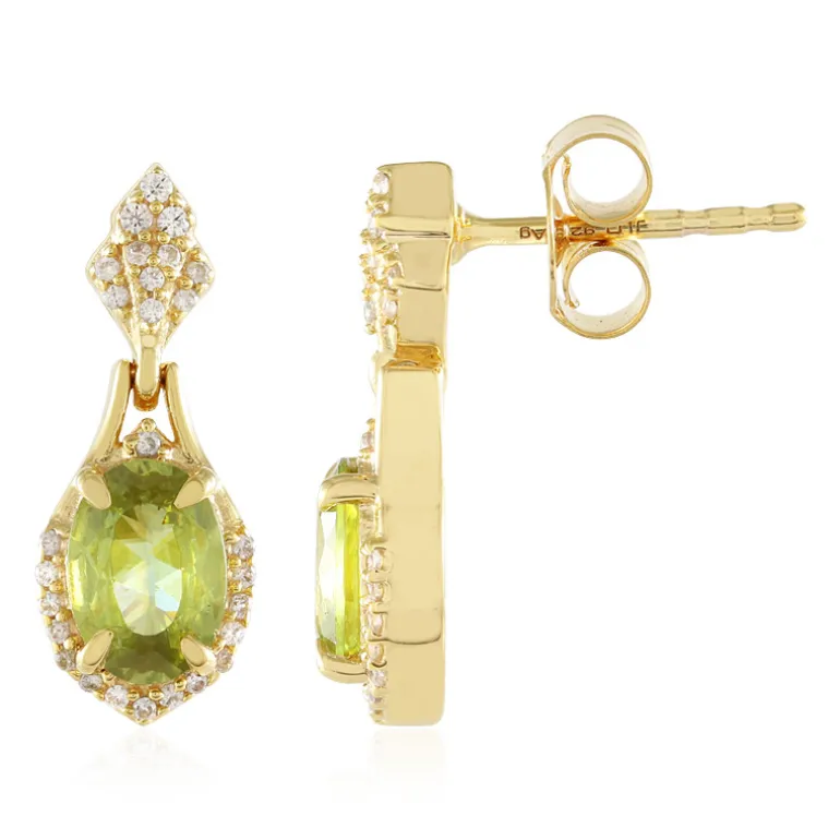 Entdecken Sie die Eleganz dieser atemberaubenden Ohrringe mit 1,24 Karat Sphene im Ovalschliff aus Madagaskar, veredelt durch funkelnde Zirkone aus Kambodscha. Die Ohrringe sind aus 925er Sterlingsilber mit einer glänzenden Goldplattierung gefertigt und haben eine zierliche Länge von 18 mm. Sie eignen sich perfekt für abendliche Anlässe oder als glamouröse Ergänzung zu Ihrer Alltagskleidung. Sie fangen das Licht ein und werten jedes Ensemble auf.