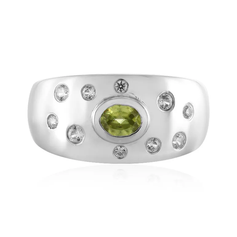 Entdecken Sie den modernen Charme dieses Rings aus Sterlingsilber mit einem glänzenden brasilianischen Sphen-Edelstein im Ovalschliff von 0,288 Karat. Der lebhafte grüne Farbton wird durch funkelnde kambodschanische Zirkon-Akzente mit einem Gesamtgewicht von 0,569 ct ergänzt, die in einem modernen, aussagekräftigen Design angeordnet sind. Die Fassung aus 925er Sterlingsilber wiegt ca. 3,84 g und garantiert Langlebigkeit und Glanz für das tägliche Tragen. Dieses Schmuckstück eignet sich perfekt, um Ihrer Bürokleidung einen farbigen Akzent zu verleihen oder Ihre Abendgarderobe mit seiner auffälligen Brillanz aufzuwerten.